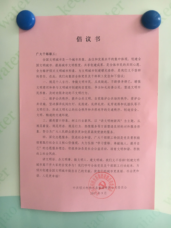 為動員集團全體黨員干部職工積極參與創文活動,日前,集團黨委發出倡議書,號召全體黨員干部職工,積極行動起來,為紹興創建全國文明城市作出應有的貢獻。倡議書提議:集團全體黨員干部職工要規范個人言行,爭做文明市民;要維護公共秩序,提升公共文明;要擦亮窗口形象,樹立行業新風;要深化志愿服務,促進社會和諧。