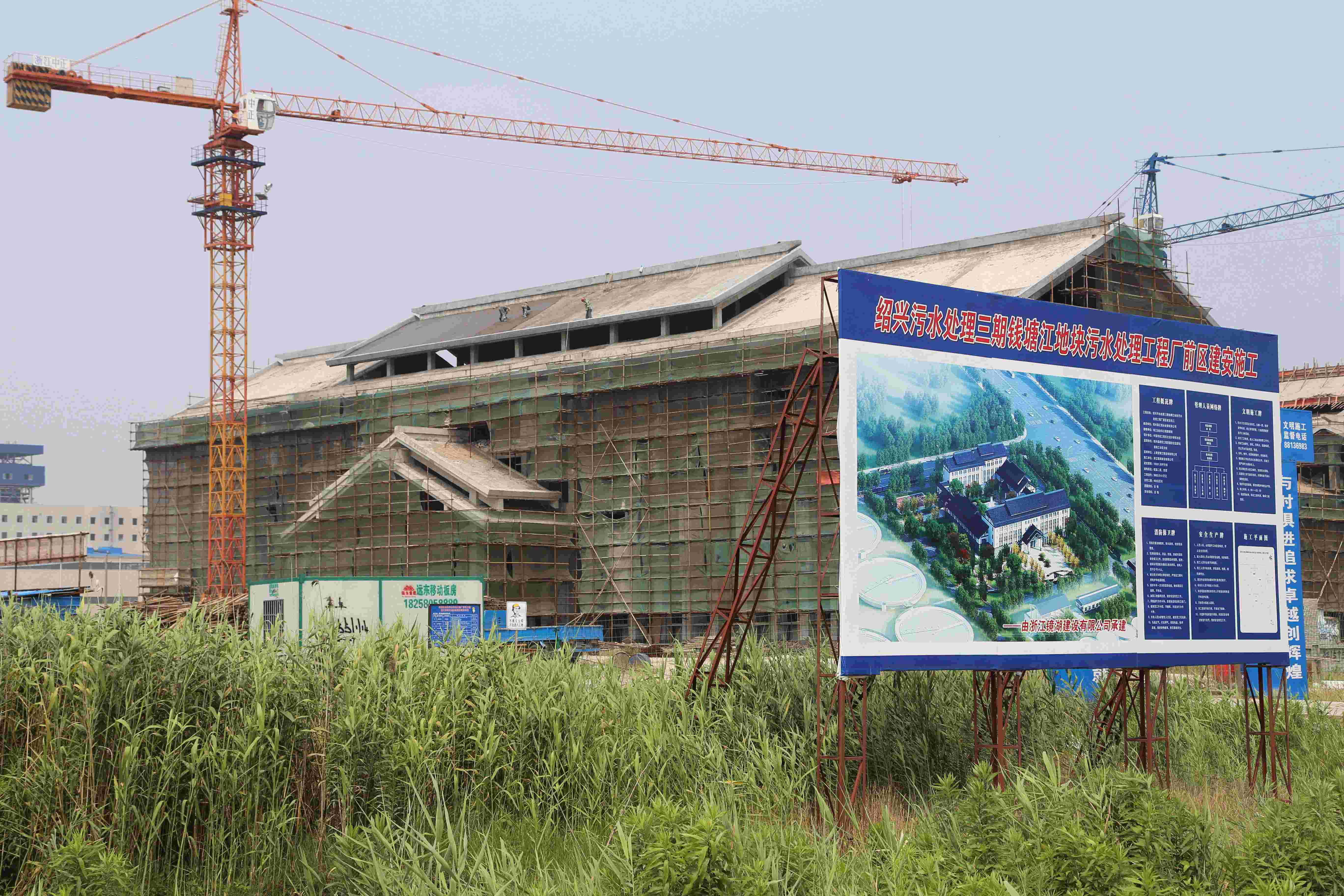 截至5月底,錢塘江地塊污水處理工程廠前區分項完成辦公樓及化驗樓、職工宿舍及綜合樓的斜屋面砼澆筑,按計劃順利結頂。